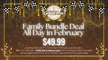 Come in Every Day in February and get a $50 Fun Card with a FREE Double the Bonus Cash ($20) AND a FREE Family Bundle Meal Deal (One Large Cheese Pizza, Four Hoodsie Cups and Four Fountain Sodas) for $49.99
